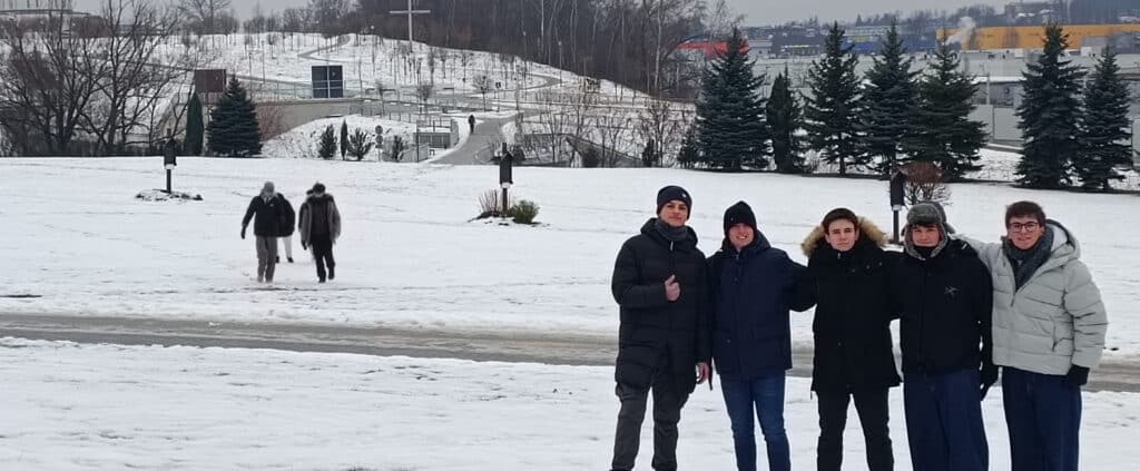 Por la mañana hemos salido hacia las afueras de Cracovia para visitar el Santuario de san Juan Pablo II. Allí hemos podido ver, entre otros objetos personales, la sotana con las manchas de sangre que llevaba el Papa el día del atentado que sufrió en la plaza de San Pedro, el 13 de mayo de 1981. Ha sido una visita que impresiona y ayuda a comprender mejor la dimensión humana y espiritual de su figura. Todo estaba cubierto de nieve y el frío se hacía notar desde primera hora.
